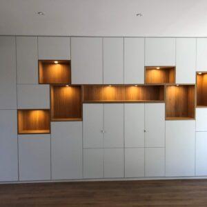 meubles sur mesure en bois Rénovation complète d’une maison : Menuiserie traditionnelle : portes, placards, plinthes et sol PVC imitation parquet. Entourage de l’escalier béton avec ensemble de tasseaux chêne massif, habillage stratifié blanc et intégration d’un placard penderie. Réalisation d’un très beau meuble de salon en panneaux blanc finition Touch avec portes sur toucher lâcher (sans...